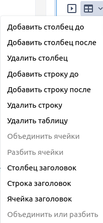 После вставки таблицы мы можем менять ее конфигурацию через контекстное меню таблицы на панели инструментов: