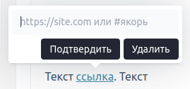 Кликаем на кнопку создания ссылки. И видим всплывающее окно над выделенным фрагментом текста, где мы можем указать адрес ссылки. Доступно 2 вида ссылок: