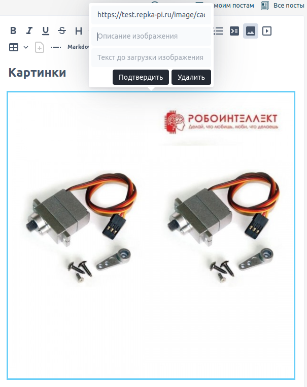 Обратите внимание что в редакторе доступно 2 режима ввода содержимого: Визуальный редактор и Markdown. Markdown режим делает возможным более тонкую настройку вертки статьи. Редактор Markdown совметим с нотацией языка CommonMark с расширениями GFM Tables, GFM Strikethrough, GFM Task list и Heading ID.