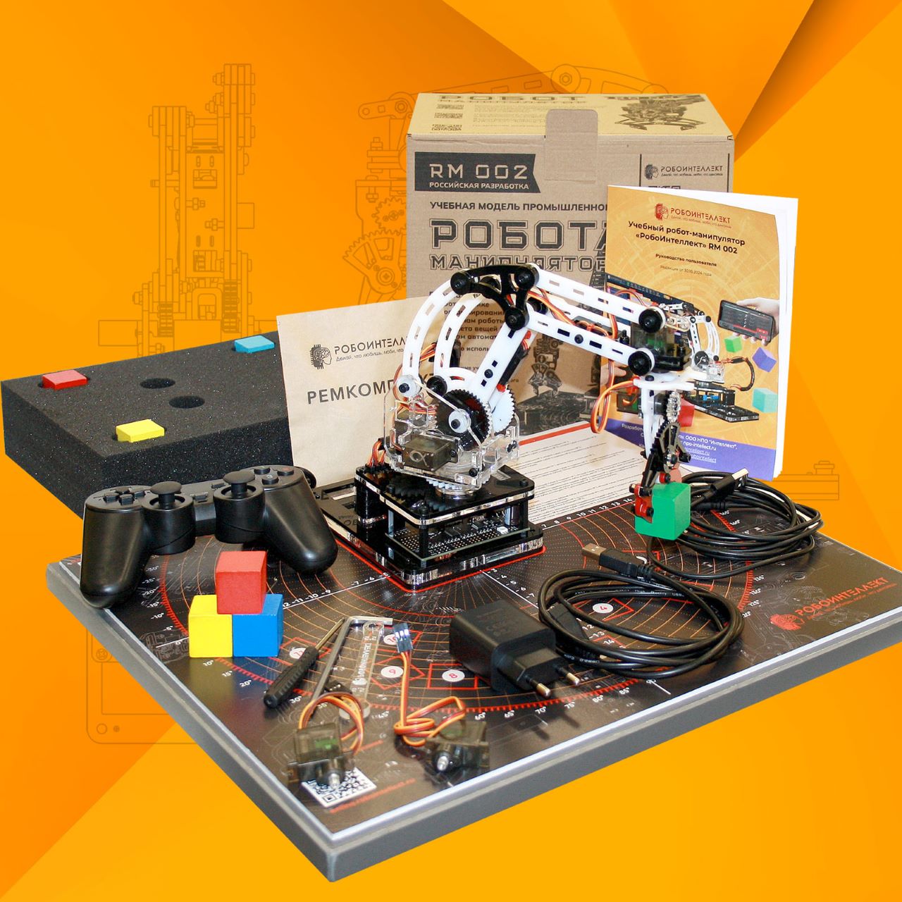 - В комплектацию робота-манипулятора "РобоИнтеллект" RM002 входит уникальная износостойкая координатная сетка, изготовленная из листа ПВХ, на которой приведены примеры интересных заданий для знакомства с ручным управлением роботом. Ручное управление может быть выполнено с помощью геймпада (джойстика), клавиатуры и "мыши" ПК или смартфона - это наглядный пример устройства и практического применения роботизированных манипуляторов.